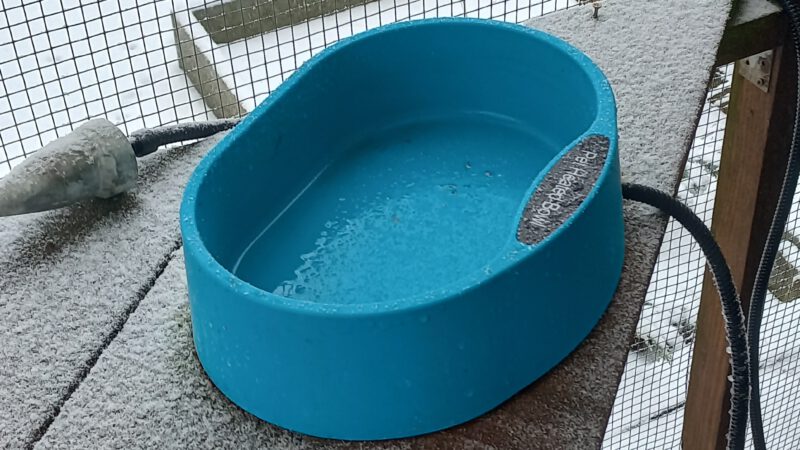 Mittlerweilen gibt es im Internet „beheizbare Hunde – Näpfe“, die sich für uns hervorragend eignen. Ich empfehle hier möglichst die XXL – Variante, in der 5 Liter Wasser dauernd Eisfrei gehalten werden können. Hier können unsere Rotschulterenten sogar zu zweit darin baden.